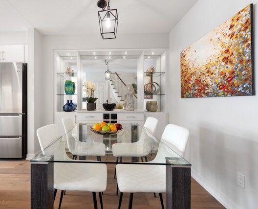 Acrylic or glass tables, slim chairs, and open-leg designs create an airy feel and help prevent a small dining area from feeling cramped. Transparent furniture tricks the eye into perceiving more space.